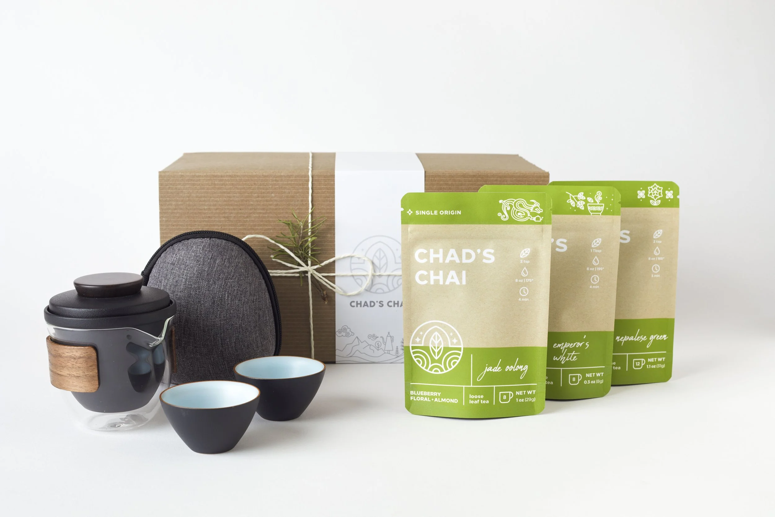The Chocolate Lovers Gift Set features our four chocolate-based tea blends (S'mores, Cocoa Maté. Cocoa Minty, and Black Leaf Cocoa), along with a chai chocolate bar crafted by Brasstown Chocolate. The Matcha Maker Gift Set includes everything you need to make amazing matcha right at home: a quality 100-prine matcha whisk, a beautiful chawan, and of course, a bag of our Slow Stone Matcha. Similarly, our Single Origin Gift Set provides the essentials for steeping high-quality full-leaf teas with a gaiwan set (includes two cups and travel case) and three different Single Origin teas: Jade Oolong, Emperor's White, and Singell Darjeeling. The Tea for One Gift Set sets you up perfectly to brew amazing loose-leaf tea at home; the set includes a stainless steel steeping basket, a nifty variable measuring spoon, a mug (choose glass or ceramic), and a tea of your choice. Finally, the Cozy Up Gift Set highlights a couple of our favorite teas to enjoy under a blanket in the colder months: Jamie’s Grey & caffeine-free CPR paired with local honey from Heritage Harvest Farms and a beautiful ceramic mug to sip from.